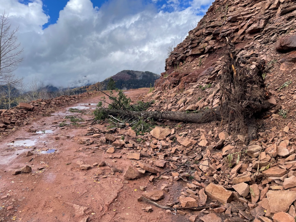 - Lime Creek Rd (591) is closed with barricades at Spud Lake on the south side and at 550 on the north side due to rockfall and road washouts.